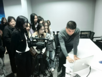 在怀柔区人力资源公共服务中心,中心主任详细讲解了本中心的主要功能和服务,参观了中心直播间,就直播所需的各类硬件如高清摄像头、专业灯光,以及虚拟场景搭建等进行了介绍。参观期间,工作人员与师生进行了精彩的交流,分享了丰富的直播技巧。
